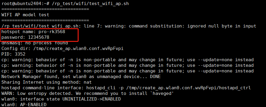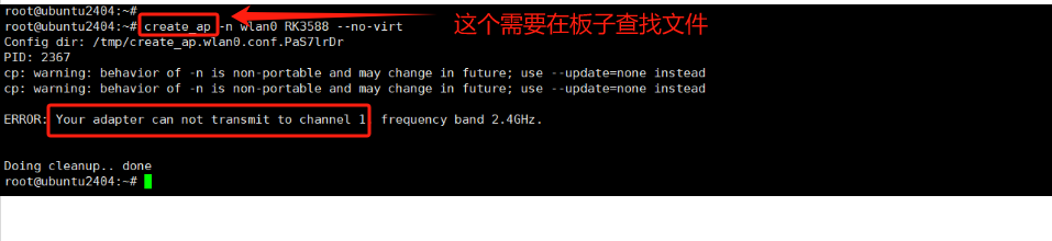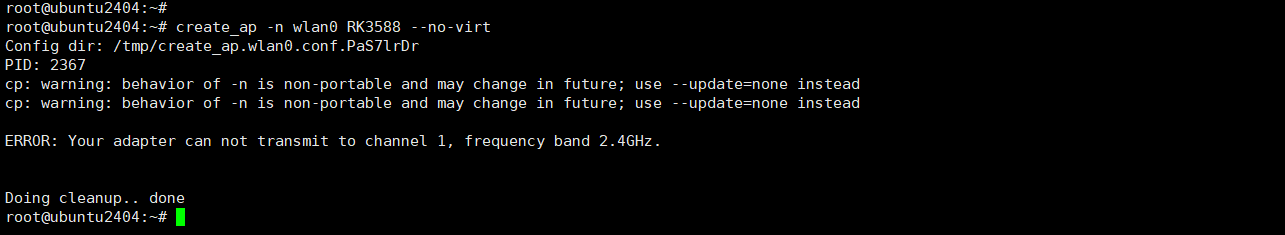 问题描述:根据wiki说明的测试脚本/rp_test/wifi/test_wifi_ap.sh 创建热点失败。直接使用指令create_ap wlan0 eth0 RK3588 00000000 --no-virt 也是同样情况